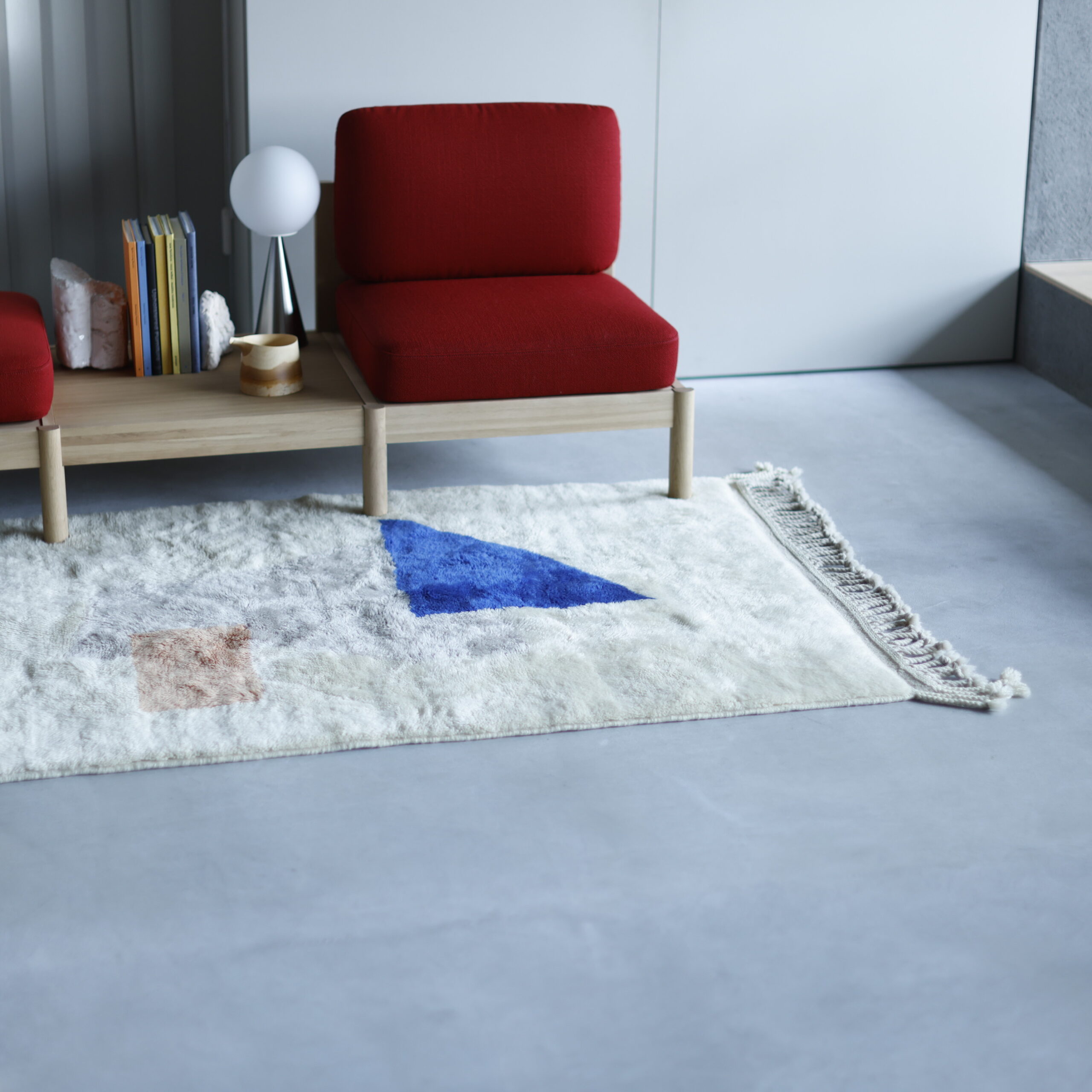 〈モダンなデザインのモロッコの手織りラグ。〉